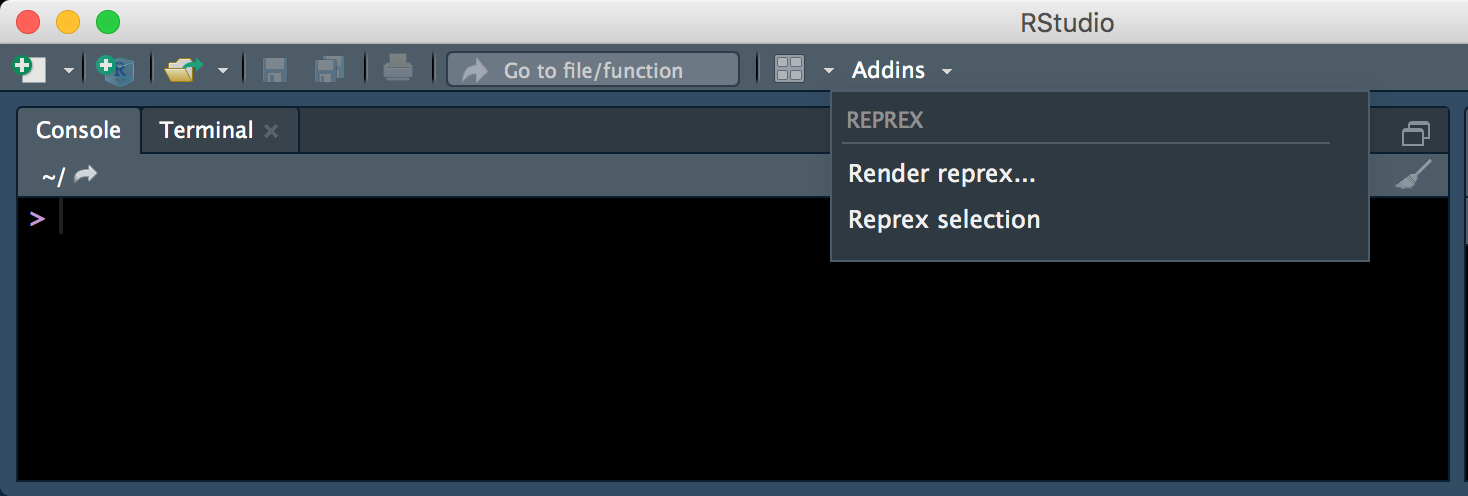 This means that you can now access the handy reprex addins from the RStudio drop-down menu.