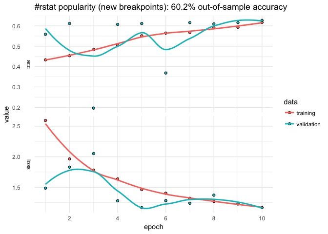 The model only classifies about 55% of the out-of-sample data correctly and that predictive accuracy doesn’t improve after the first ten epochs. The confusion matrix suggests that model does best with tweets that are retweeted a handful of times but overpredicts the 1-10 level. The history plot also suggests that out-of-sample accuracy is not very stable. We can easily change the breakpoints and number of epochs.