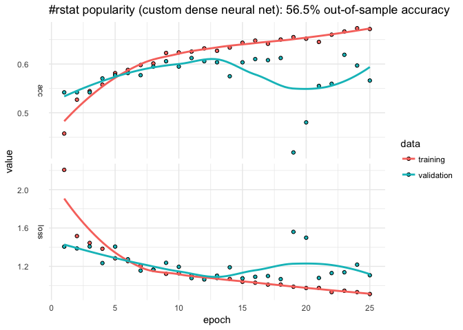 Let’s start with a dense neural net, the default of kms. We can use base R functions to help clean the data–in this case, cut to discretize the outcome, grepl to look for key words, and weekdays and format to capture different aspects of the time the tweet was posted.