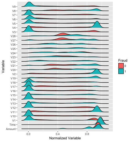 For an autoencoder to work well we have a strong initial assumption: that the distribution of variables for normal transactions is different from the distribution for fraudulent ones. Let’s make some plots to verify this. Variables were transformed to a [0,1] interval for plotting.