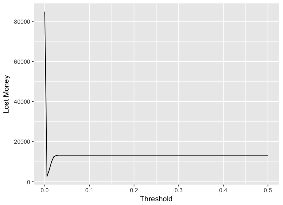 qplot(possible_k, lost_money, geom = "line") + labs(x = "Threshold", y = "Lost Money")