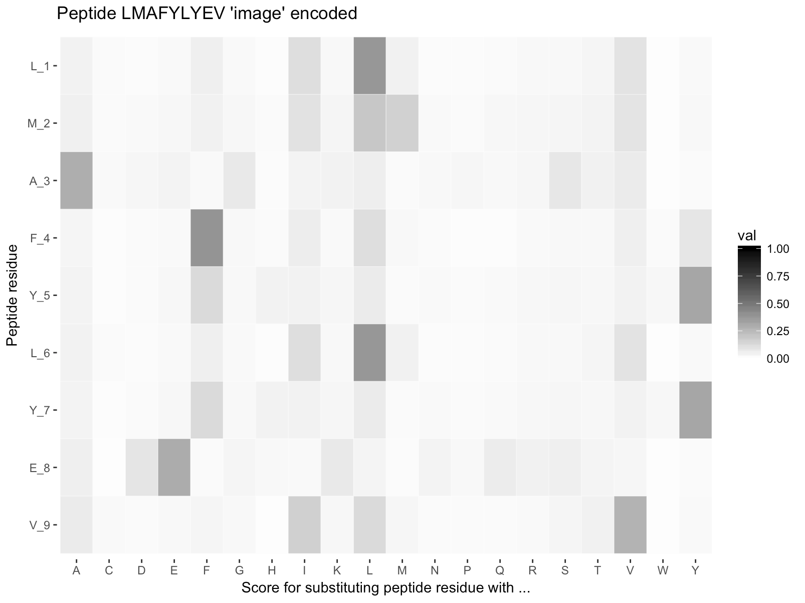 In the following each peptide will be encoded by assigning a vector of 20 values, where each value is the probability of the amino acid mutating into 1 of the 20 others as defined by the BLOSUM62 matrix using the pep_encode() function from the PepTools package. This way each peptide is converted to an ‘image’ matrix with 9 rows and 20 columns.