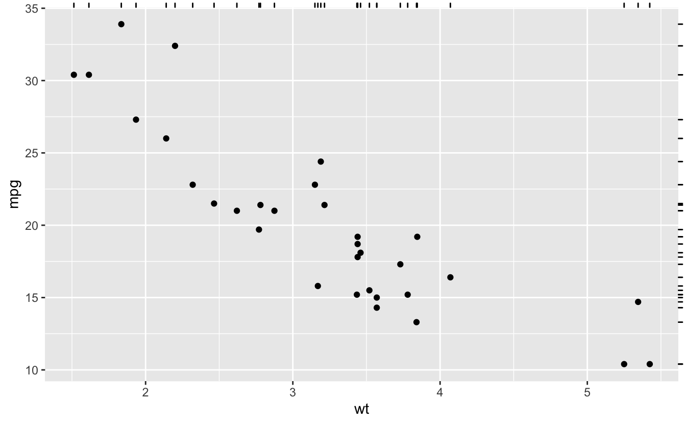 geom_rug has seen a range of improvements to give users more control over the appearance of the rug lines. The length of the rug lines can now be controlled and it is further possible to specify that they should be placed outside of the plotting region: