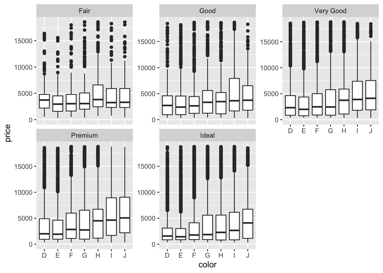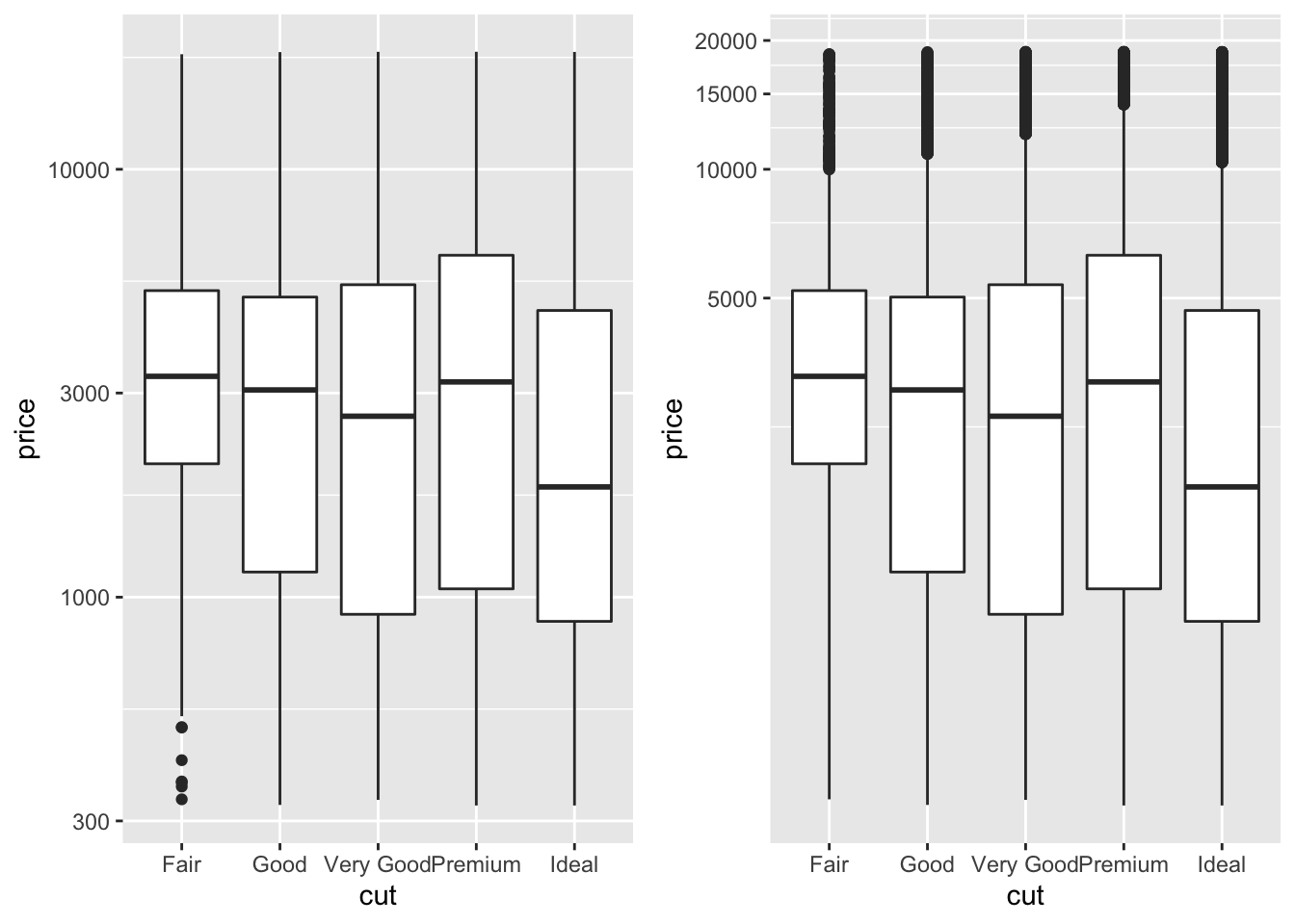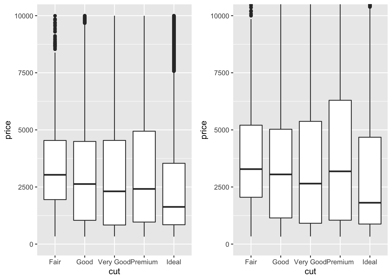 p <- ggplot(diamonds, aes(cut, price)) + geom_boxplot()