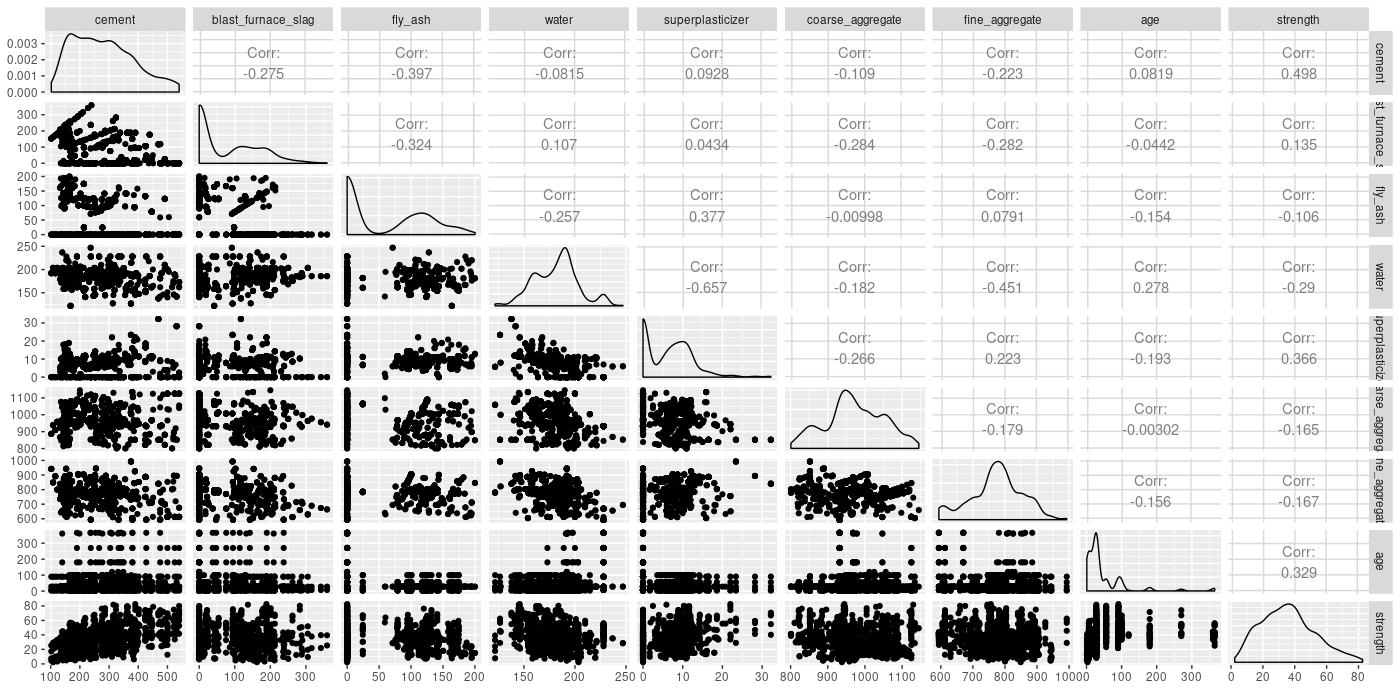 We have eight predictors, all numeric. With the exception of age (in days), these represent masses (in kg) in one cubic metre of concrete. The target variable, strength, is measured in megapascals.