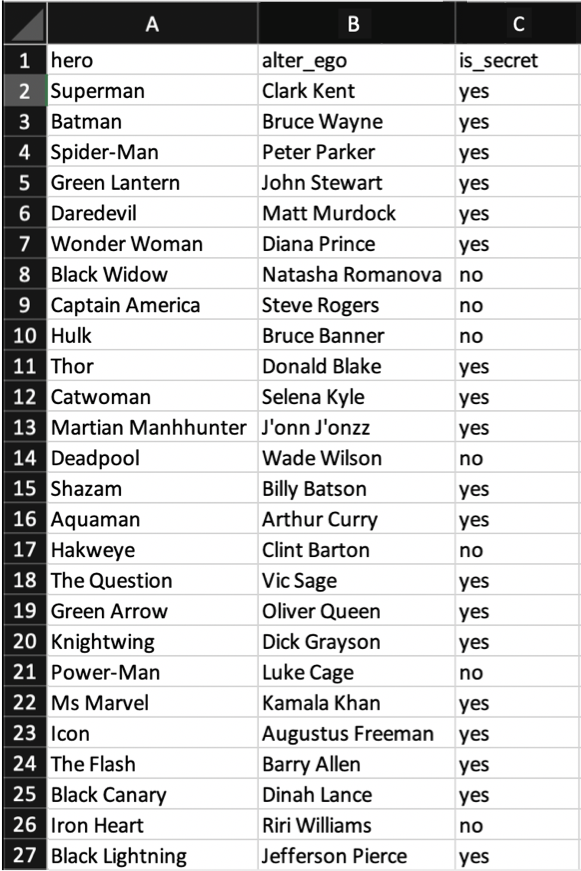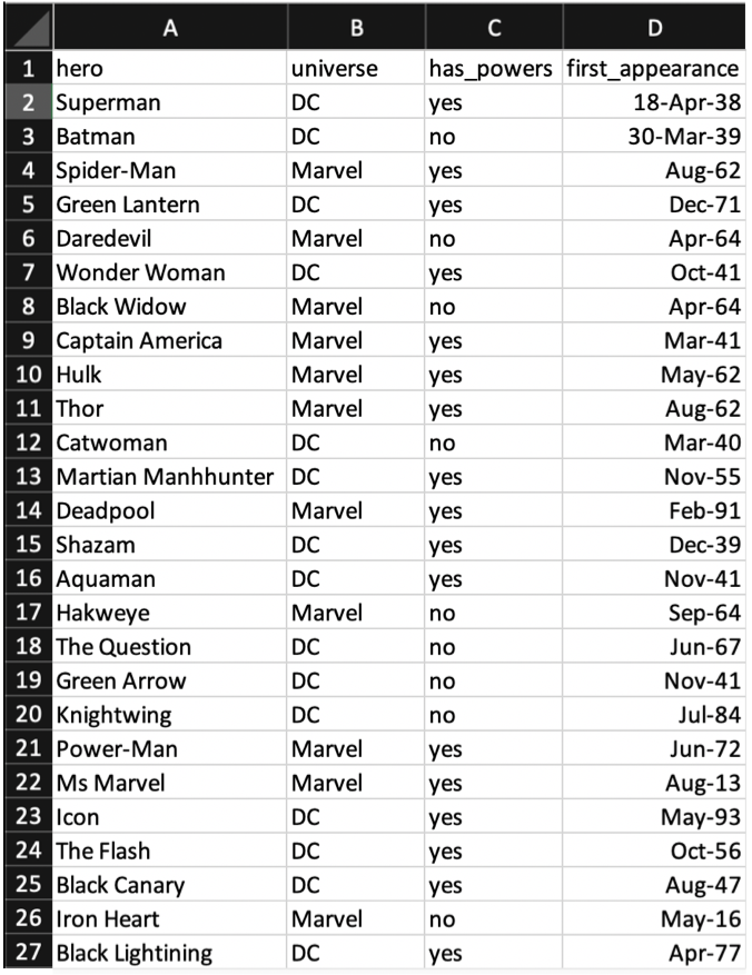 There are, of course, instances in which we’ll need to pull in data from multiple sheets, and the superheroes data set is no exception. We’ve been informed there are an additional two sheets that have recently been added. One containing information on the main power or skill of each character,