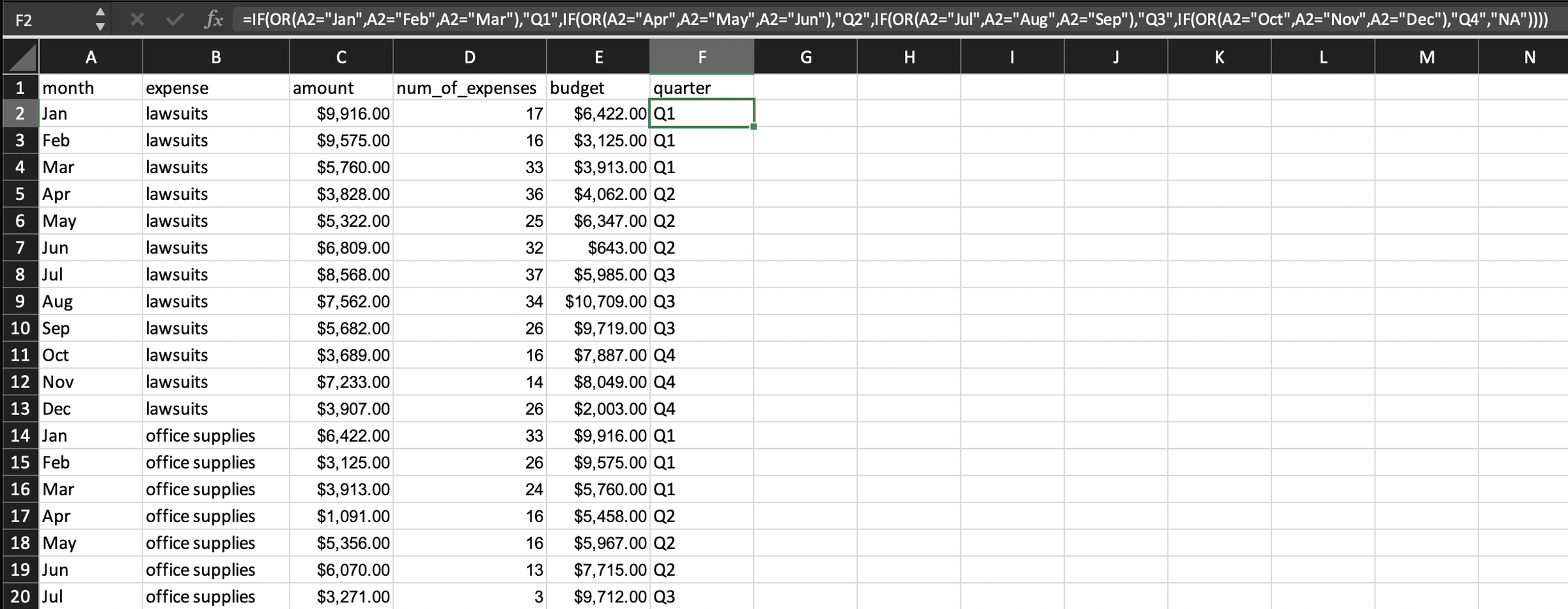 =IF(OR(A2="Jan",A2="Feb",A2="Mar"),"Q1",IF(OR(A2="Apr",A2="May",A2="Jun"),"Q2",IF(OR(A2="Jul",A2="Aug",A2="Sep"),"Q3",IF(OR(A2="Oct",A2="Nov",A2="Dec"),"Q4","NA"))))