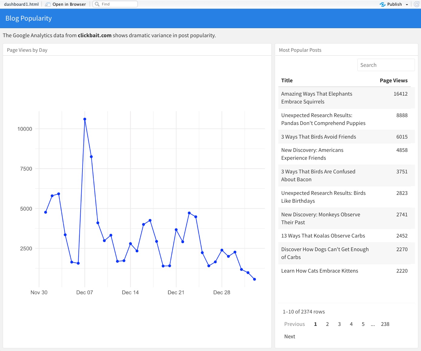 To make it easy for readers to reproduce this dashboard, I’ve constructed a synthetic set of Google Analytics data named clickbait_GA_data.csv for a hypothetical blog at the address clickbait.com. At the time of this writing, that domain was currently for sale and therefore shouldn’t be confused with any real blog. While the synthetic traffic comes from the Google Analytics log from an actual blog, the titles and URLs of all the articles are made up (although I wish I could find out the 3 Ways That Birds Are Confused About Bacon). The dataset contains more than 32,000 visits and 105,000 page views conducted over one month.