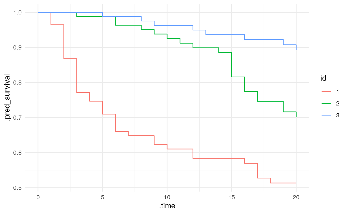 ggplot(aes(x = .time, y = .pred_survival, col = id)) +