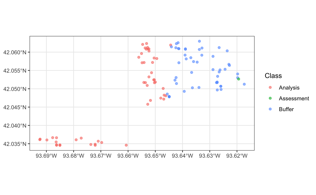 Looking at one of the splits, we can see the single assessment point, the points included in the analysis set, and the points excluded as the buffer.