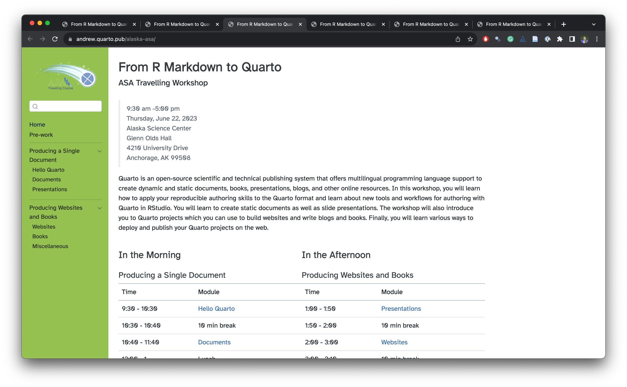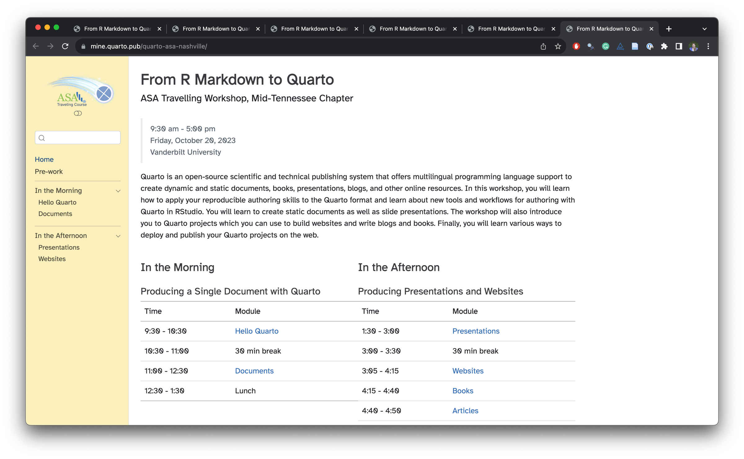 In 2023, Dr. Andrew Bray and I gave a series of six workshops on Quarto as part of the Traveling Courses program sponsored by the American Statistical Association .