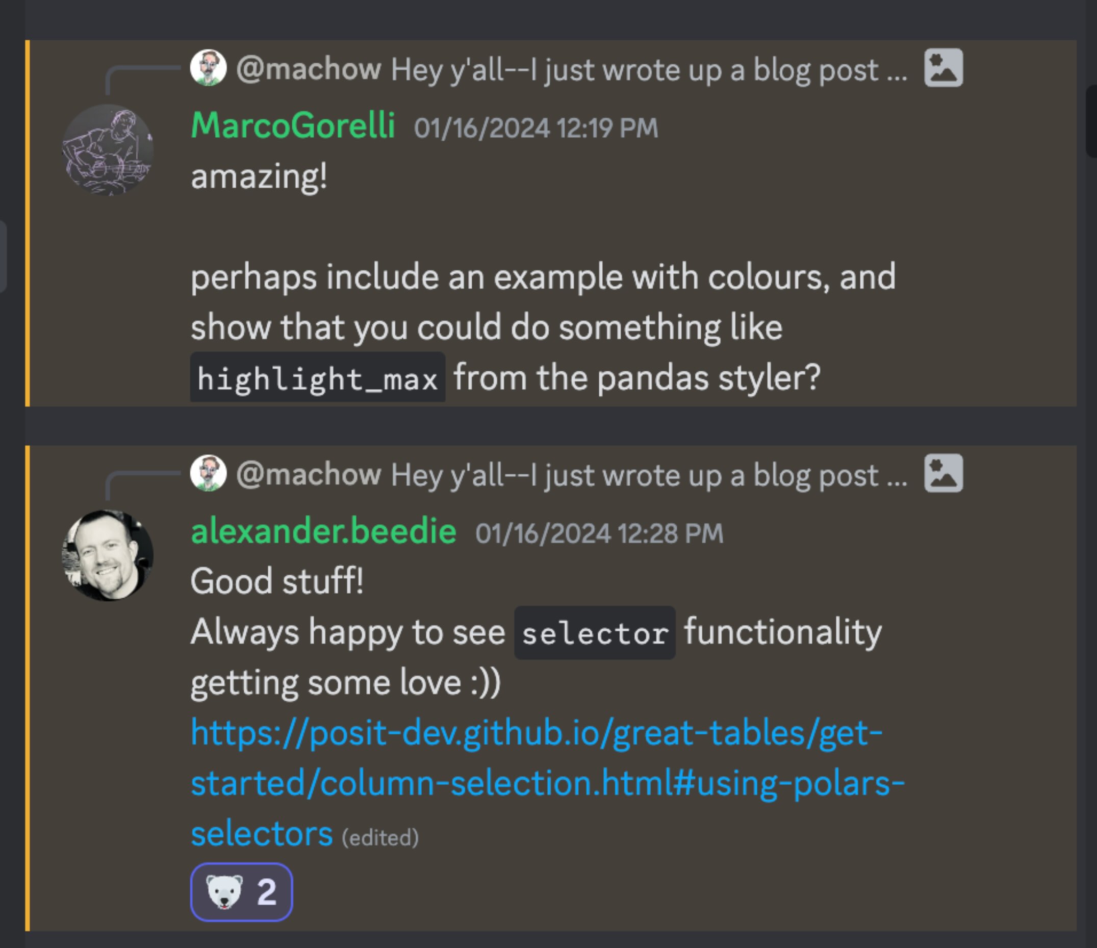 When talking about the Polars integration, people are often surprised to hear it happened when Great Tables was only 8 months old. Moreover, the whole process of how open source maintainers chat and discuss teaming up can feel shrouded in mystery.