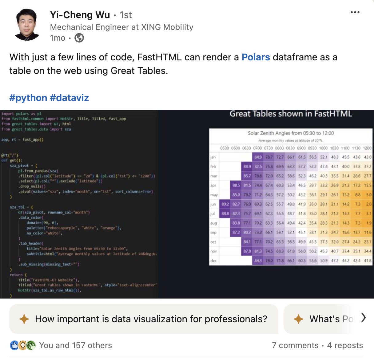 In addition to his PRs, Jerry has done really Great Work sharing about table display. The most interesting example of this to me is that he discovered that Polars, Great Tables, and FastHTML work well together.