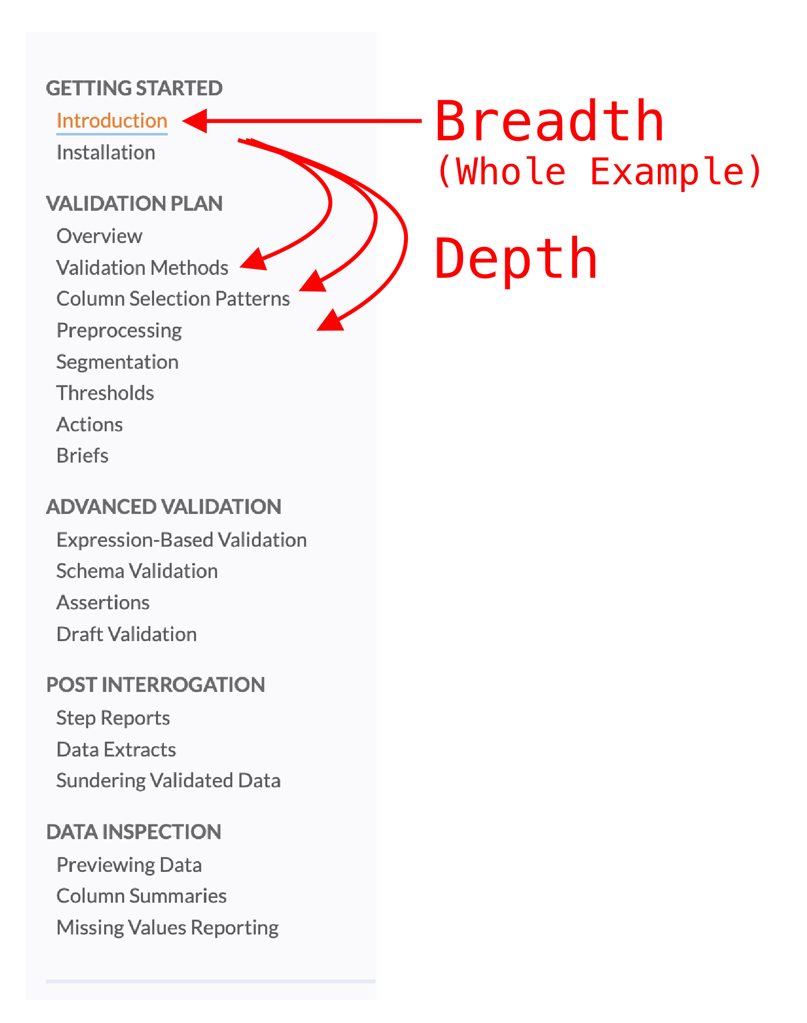 We chose to use a spiral sequence for our Introduction and Validation Plan section. The Introduction quickly covers parts of validation plan, while each article of the Validation Plan section dives deeper into different aspects of defining validation rules.