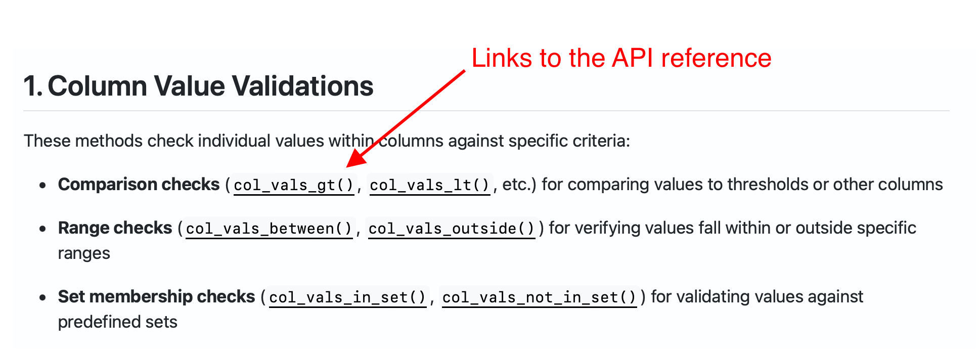 Compare the segments= parameter in the API Reference (e.g., look at col_vals_gt() ) and the Segmentation article to get a feel for how each location documents the segments feature.